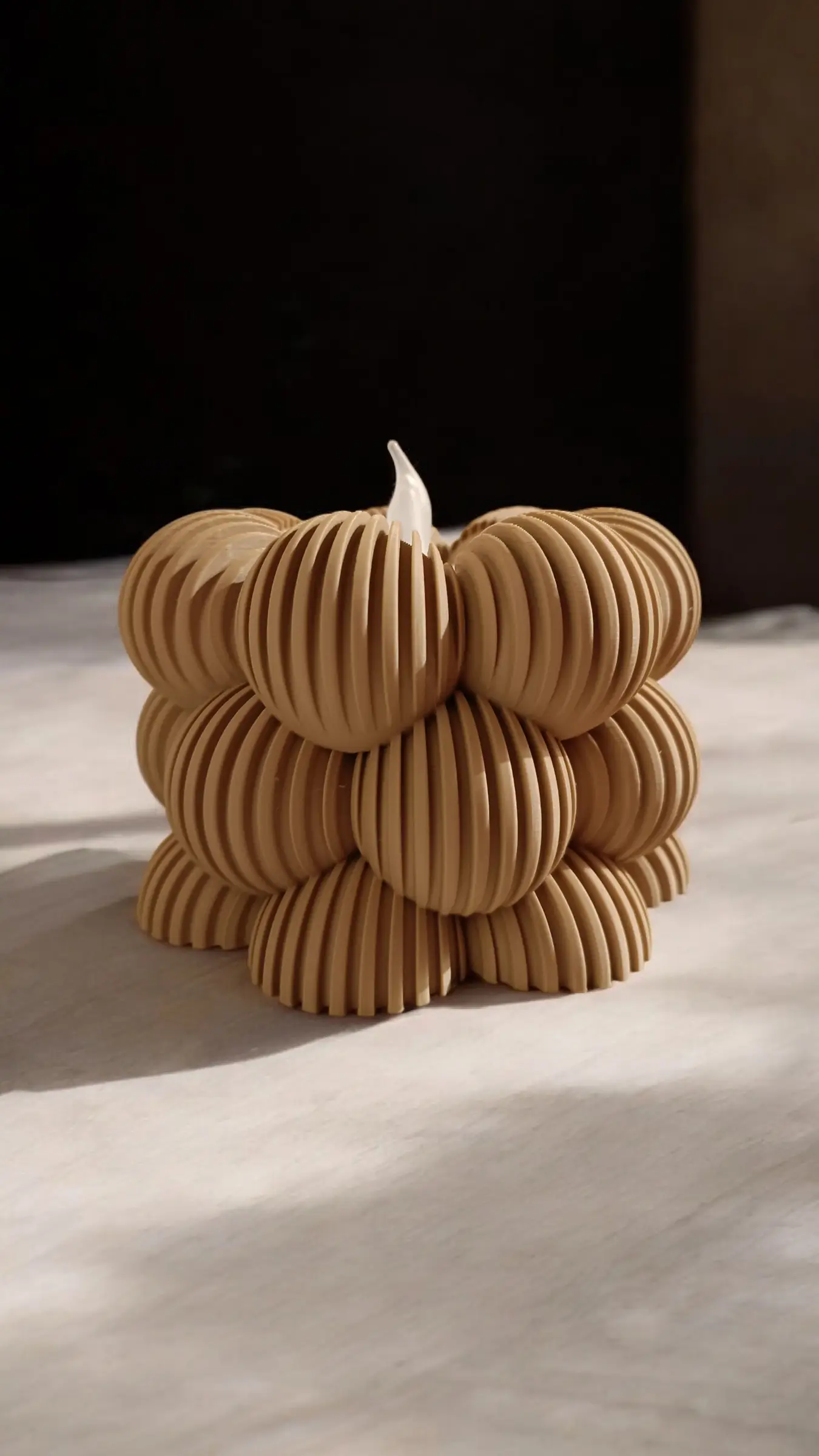 Inspired by natural formations, the “BaubleGlow Ribbed Tealight”, presents a dynamic cluster of spheres and elegant ribbed curves. This 3D printed piece offers a modern, organic aesthetic, perfect for accentuating your decor. Designed solely for LED electronic tealights to prevent heat damage and maintain its unique form.