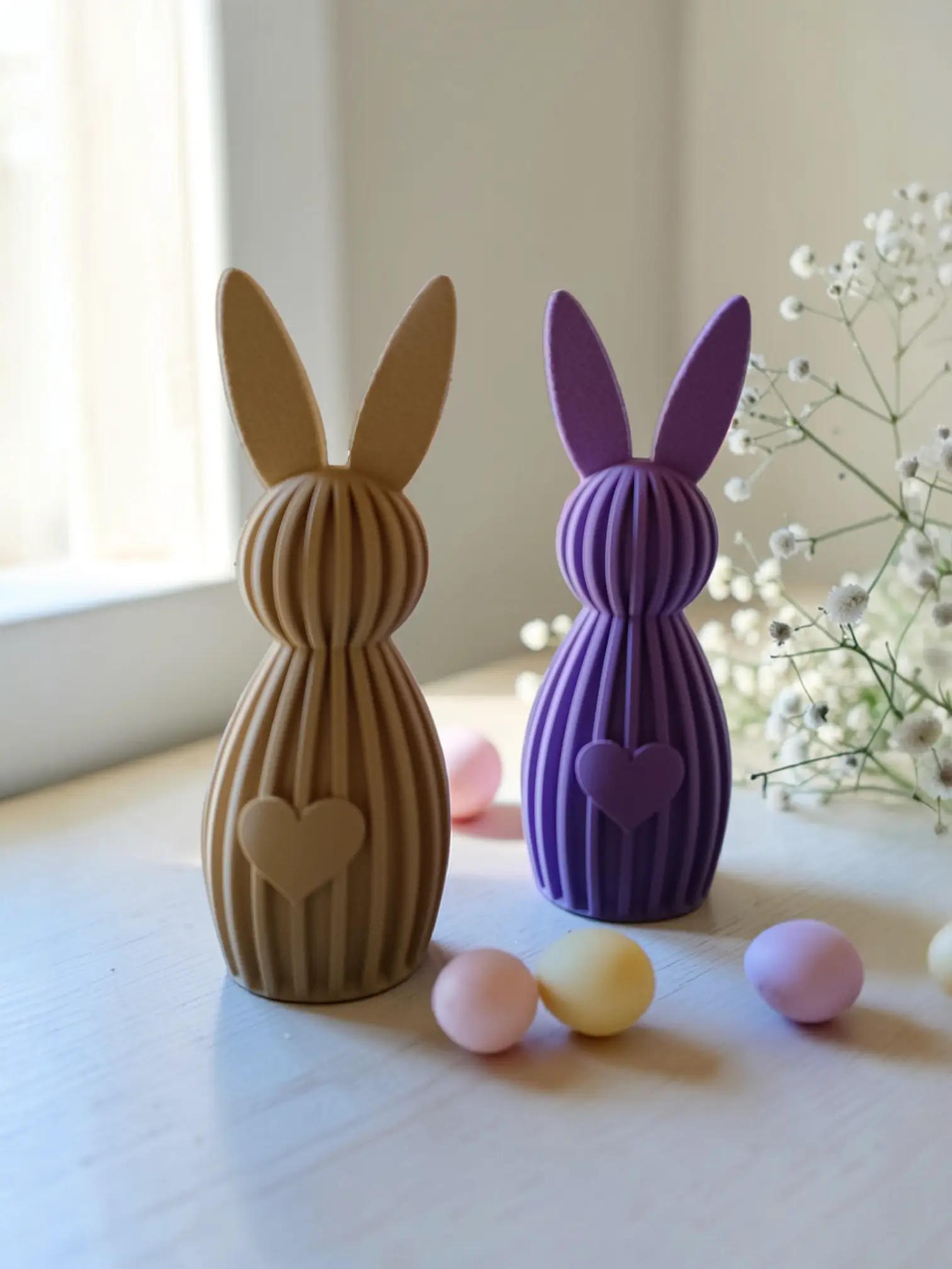 This high-quality decorative bunny figurine set prioritizes clean lines, geometric simplicity, and a sophisticated matte finish. The set is presented in a curated two-tone palette: a soft, vibrant lavender and a neutral, earthy desert tan, allowing for flexible integration into both traditional and modern spring decor.