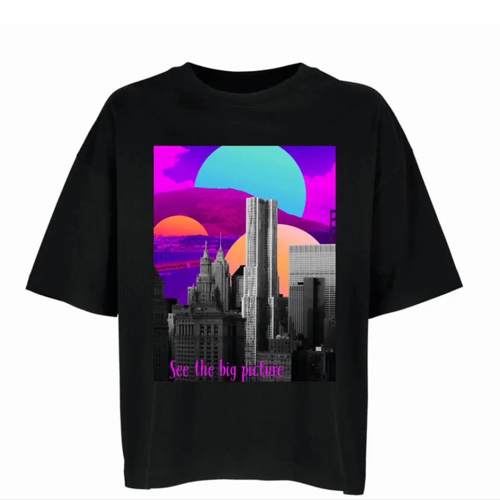 An oversized graphic printed multi color oversized recycled t-shirt, made of cotton of ultimate  quality, which offers absolute comfort  in your everyday wear, while making a statement with its captivating message ” See the big picture ”