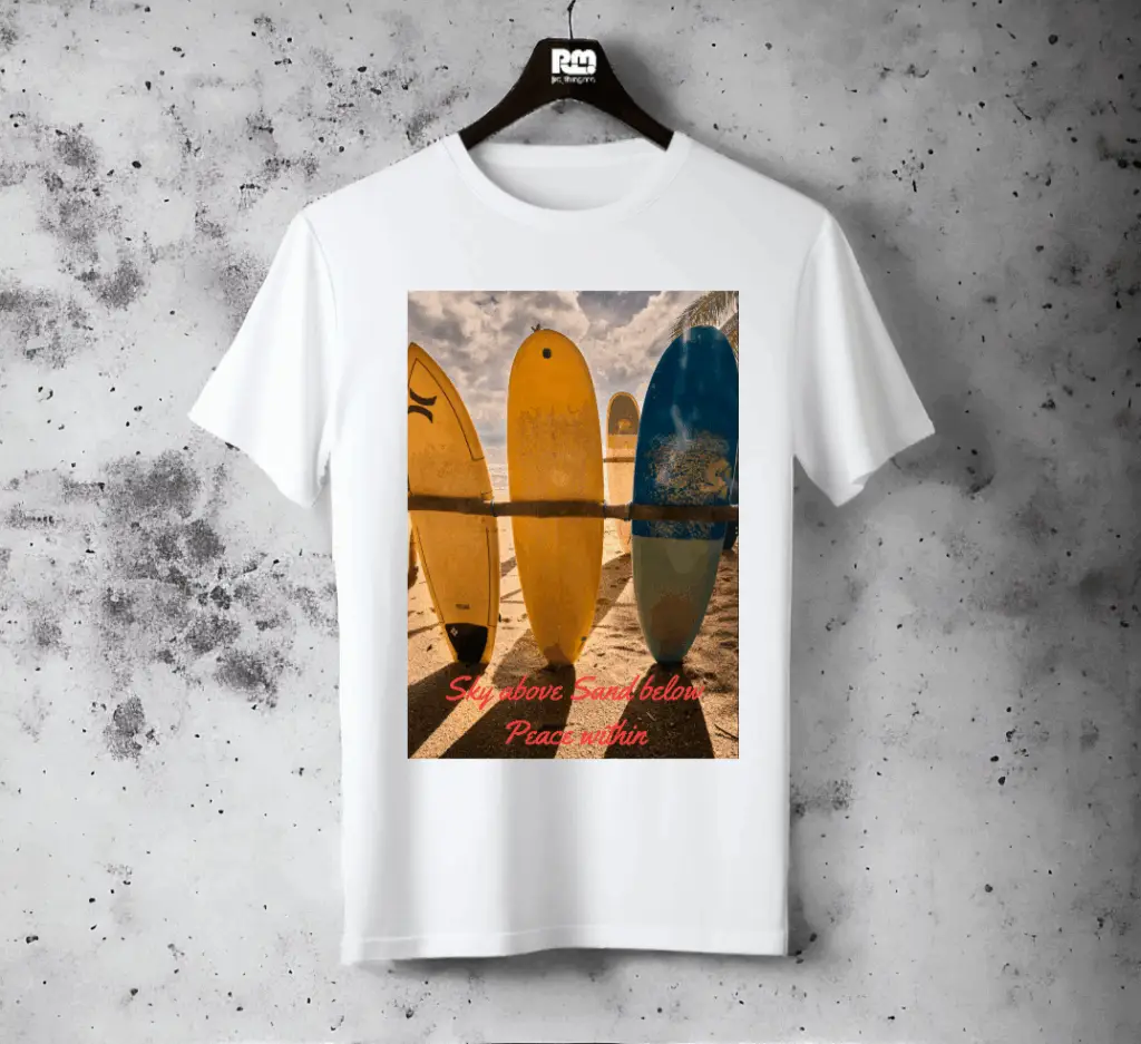 This summer cotton t-shirt embodies the spirit of balance with its inspiring message: “Sky above Sand below Peace within” Made from soft, Organic combed breathable cotton, it ensures comfort on hot days while making a bold statement. The classic white color offers versatility, allowing it to be effortlessly paired with shorts or jeans, for any casual outing.
