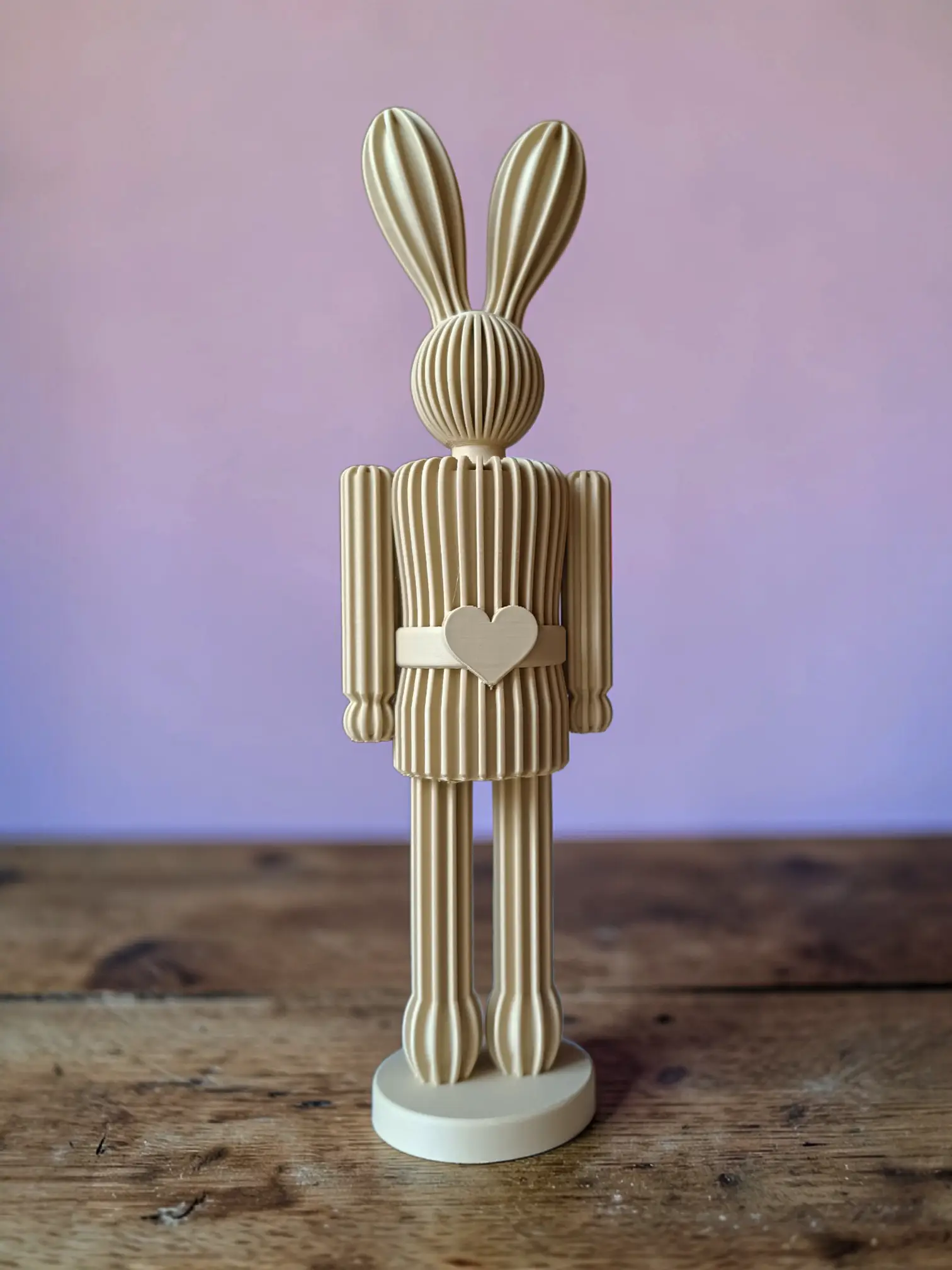 Upgrade your spring table with the 3D printed Striped Nutcracker Easter Bunny. The body features a striped pattern, offering a modern twist on the classic silhouette.
