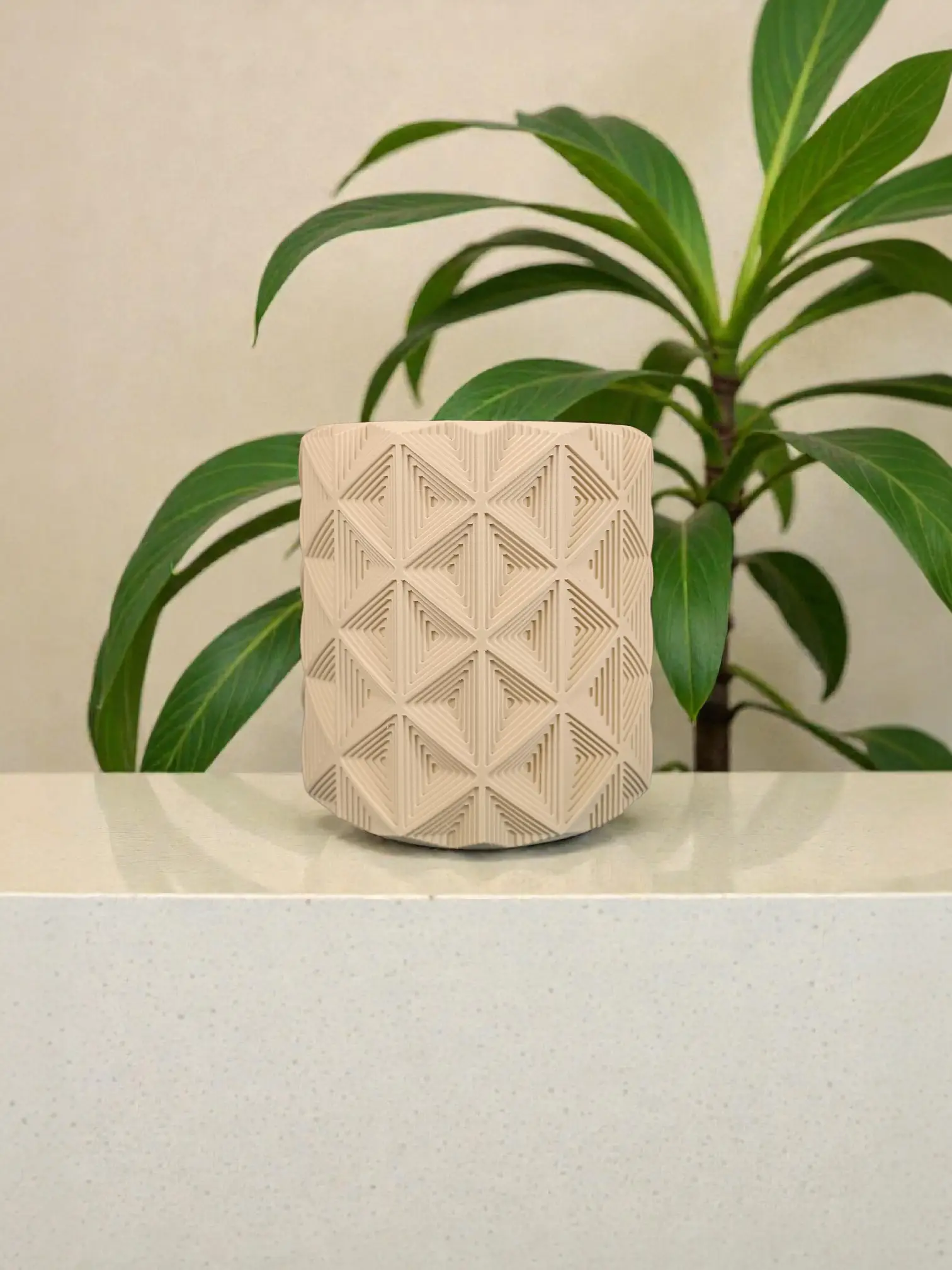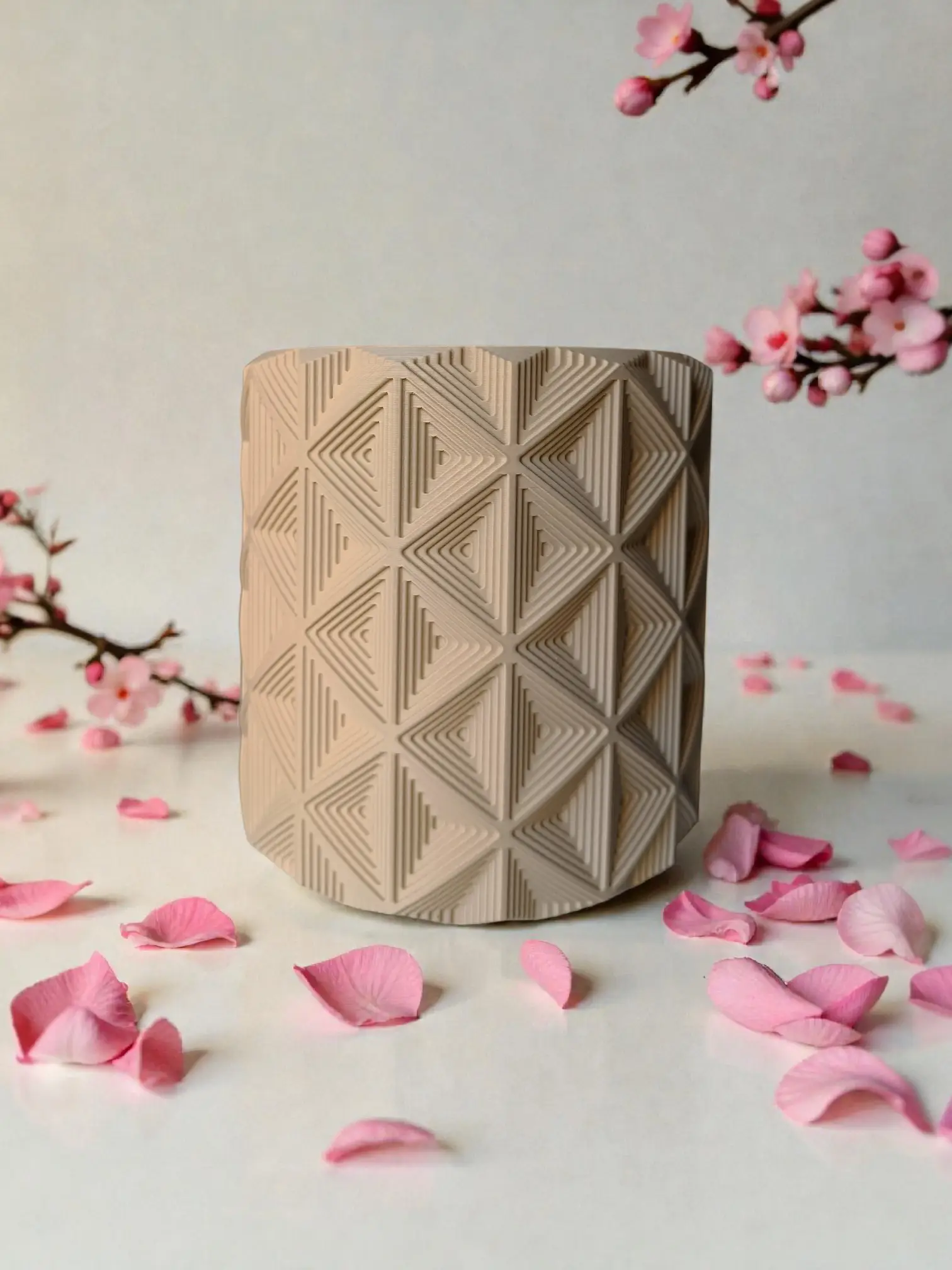 Featuring a desert tan hue and a repeating geometric pattern it represents a synthesis of mid-century modern influences and contemporary 3D printing techniques.
