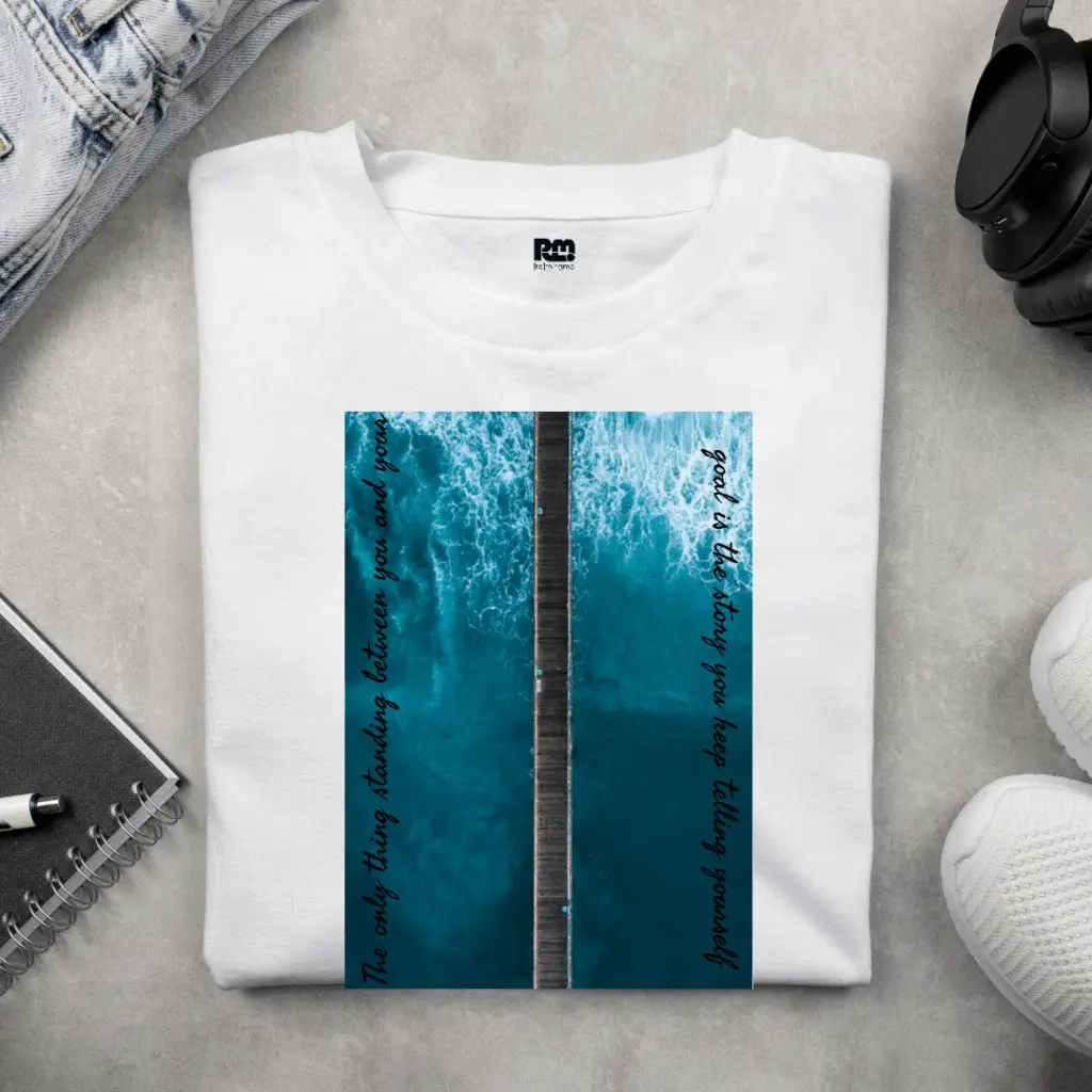 This colorful graphic print t-shirt “The only thing standing between you and your goal, is the story that you keep telling yourself ” acts as an icebreaker, conveying messages of encouragement, strength and confidence wherever you wear it, helping reframing negative stories into empowering ones, in order to cultivate a stronger mindset.