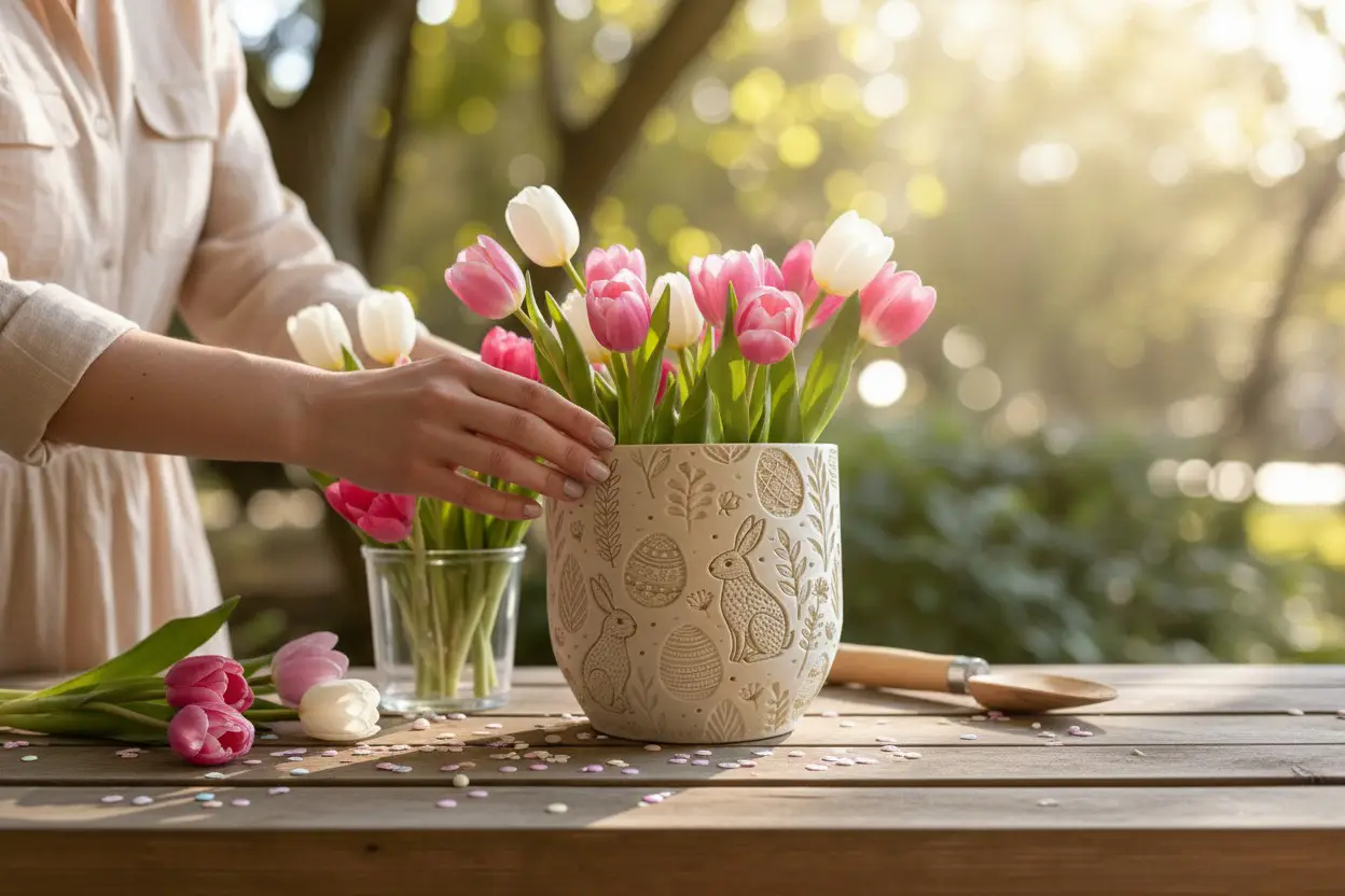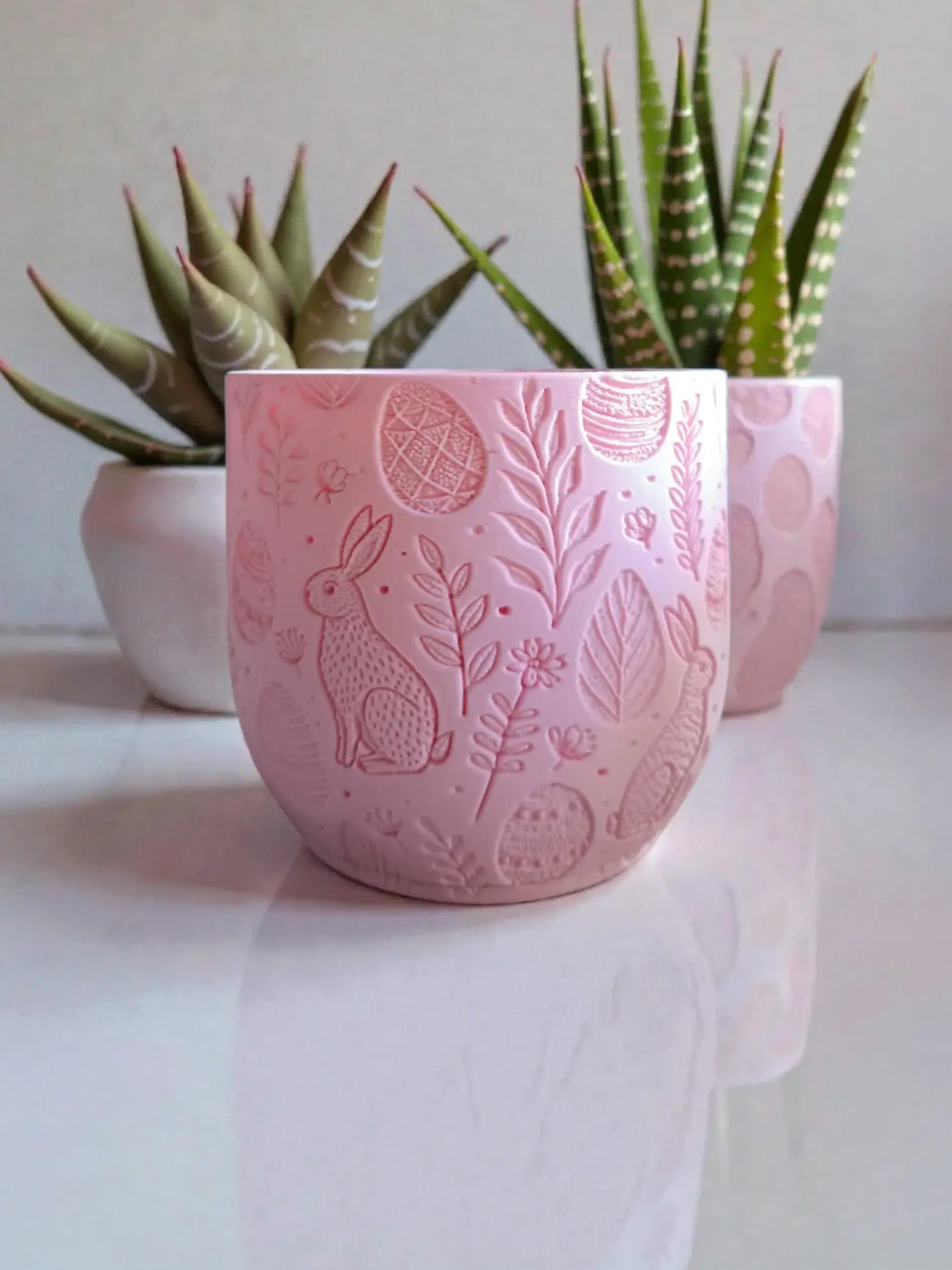This exquisite 3D-printed planter brings the festive spirit of spring and Easter. Finished in a soft, vibrant pink, the planter features intricately embossed Easter-themed patterns – including stylized bunnies, geometric egg motifs and floral embellishments – that wrap seamlessly around its exterior. For modern and rustic interior decor.