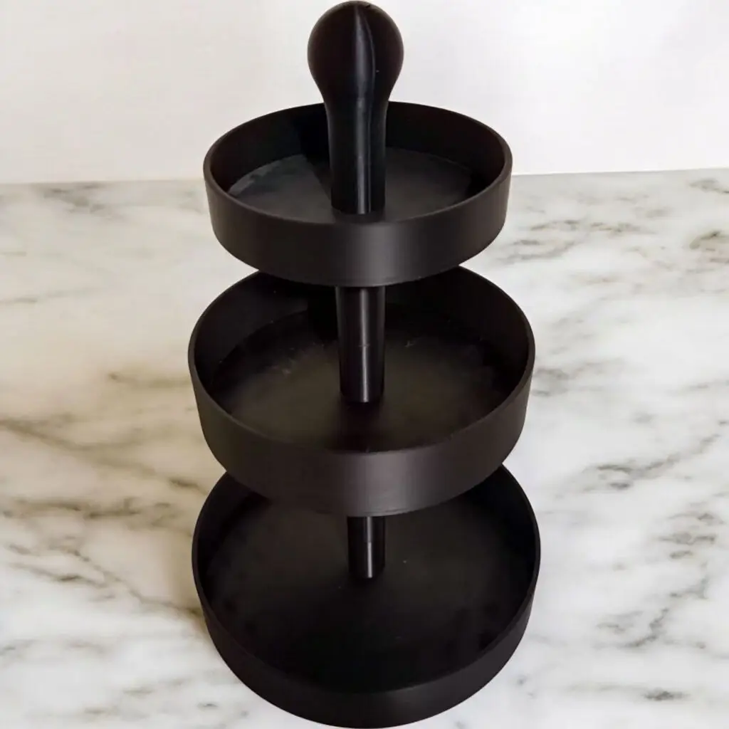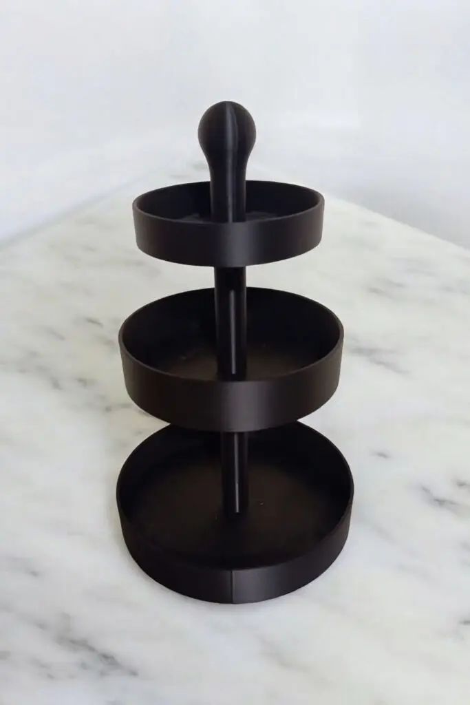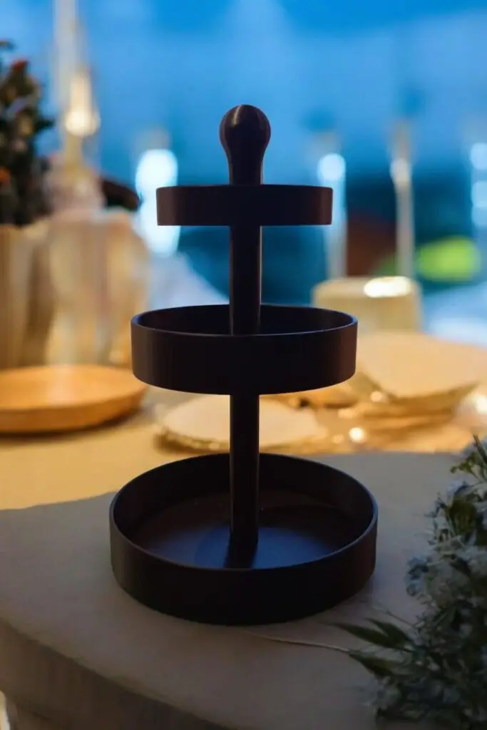 Our three-tier serving stand is a versatile solution that can be used to display a variety of snacks, cakes and other treats. The three-tier design provides ample space for displaying multiple items, while the compact footprint saves space on the table or counter. The product is available in a black and blue grey finish, which can complement a range of decor styles. Α practical and elegant serving solution that can be used in a variety of settings.